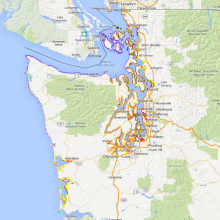 This map shows a GIS layer of all 60 shoreline habitat classes in Washington state. The map is symbolized based on marine/estuarine category and major substrate material. Marine shorelines are shown in cool colors; estuarine shorelines are shown in warm colors.