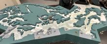 One of the first working models of Puget Sound was a scaled-down concrete reproduction, with actual water running through channels, around islands and into bays, inlets, and harbors. Motors, pumps and timing gears are part of an elaborate mechanism that replicates tides and river flows in the still-functioning model.