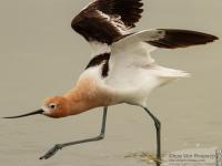 A large slender shorebird with a long, slender, recurved bill (longer and straighter in males than in females), long spindly legs, and a long neck; wings and back are boldly patterned with black and white; belly and flanks are white; head and neck and rusty in breeding plumage, gray in basic plumage; juveniles have a cinnamon wash on the head and neck; average length 46 cm (NGS 1983).