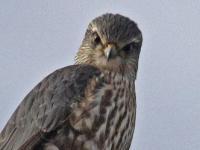 A small falcon with pointed wings, a strongly barred tail, a hooked bill, and heavy streaking below; upperparts are gray-blue in males, dark brown in females; overall, plumage is much darker in the Pacific Northwest than in central Canada and the Midwest; average length 31 cm, wingspan 64 cm (NGS 1983).