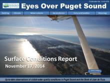 A recent cold spell hits Puget Sound lowlands, interrupting this year’s warmer air temperatures. The warm ocean coincides with new maximum water temperatures observed throughout Puget Sound in October! Hood Canal’s higher dissolved oxygen and cold water anomalies are disappearing. November brings cold water from Whidbey Basin into Puget Sound with moderate levels of chlorophyll fluorescence. Abundant smacks of jellyfish in finger inlets of South Sound observed from our flight. Red-brown blooms remain strong in smaller bays of South Sound. Visible suspended sediments in the coastal estuaries from rain, wind, and waves. Playing in the water? Visit our BEACH program.